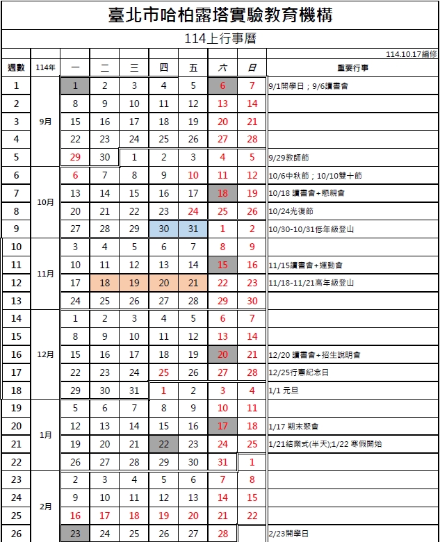114上學校行事曆Post published:2025 年 11 月 24 日Post category:學生日常 / 日誌Post comments:0 Comments行事曆下載:114上行事曆 分享 Share this content Opens in a new window Opens in a new window Opens in a new window You Might Also Like 哈柏露塔第三次辦學說明會(大湖國小場)暨小孩的體驗課 2019 年 8 月 10 日 哈柏露塔2022春季招生說明會(11/13(六)線上場) 2021 年 10 月 13 日 2024秋季(113上)小學入學招生簡章 2024 年 1 月 5 日發佈留言 取消回覆CommentEnter your name or username to commentEnter your email address to commentEnter your website URL (optional) 在瀏覽器中儲存顯示名稱、電子郵件地址及個人網站網址,以供下次發佈留言時使用。 Δ