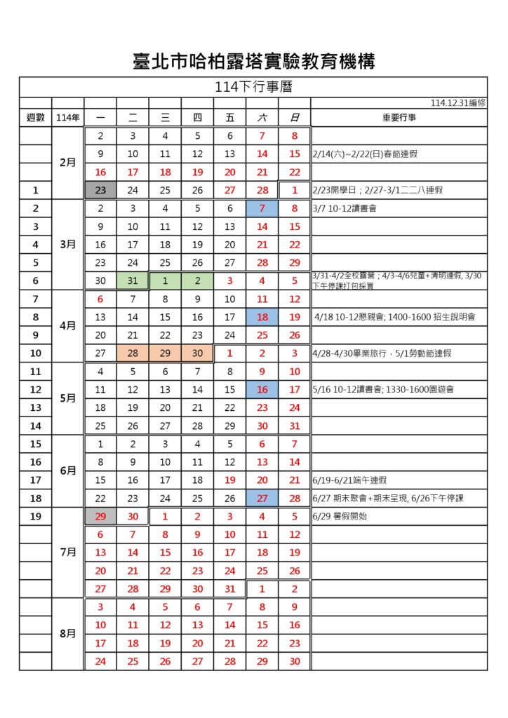 114下學校行事曆Post published:2026 年 3 月 5 日Post category:學生日常 / 最新消息Post comments:0 Comments行事曆下載:114下行事曆 分享 Share this content Opens in a new window Opens in a new window Opens in a new window You Might Also Like 第三場讀書會 2019 年 4 月 22 日 哈柏露塔辦學說明會及就讀意願調查會談 2019 年 4 月 22 日 114下學期課表 2026 年 3 月 5 日發佈留言 取消回覆CommentEnter your name or username to commentEnter your email address to commentEnter your website URL (optional) 在瀏覽器中儲存顯示名稱、電子郵件地址及個人網站網址,以供下次發佈留言時使用。 Δ